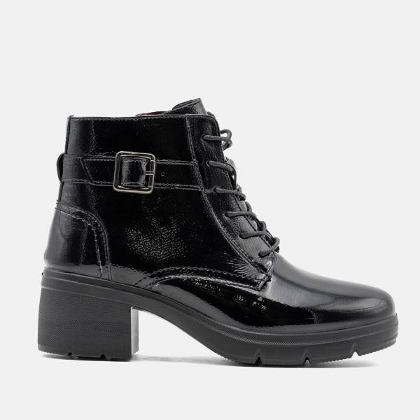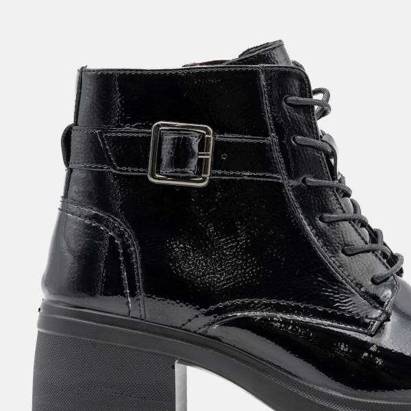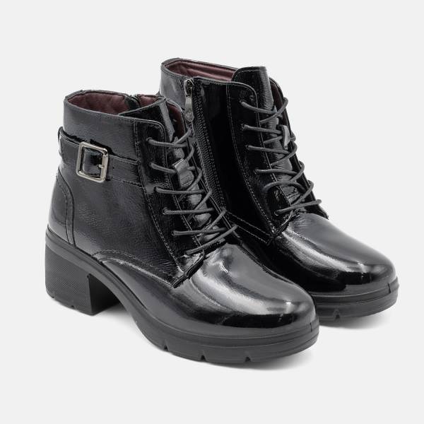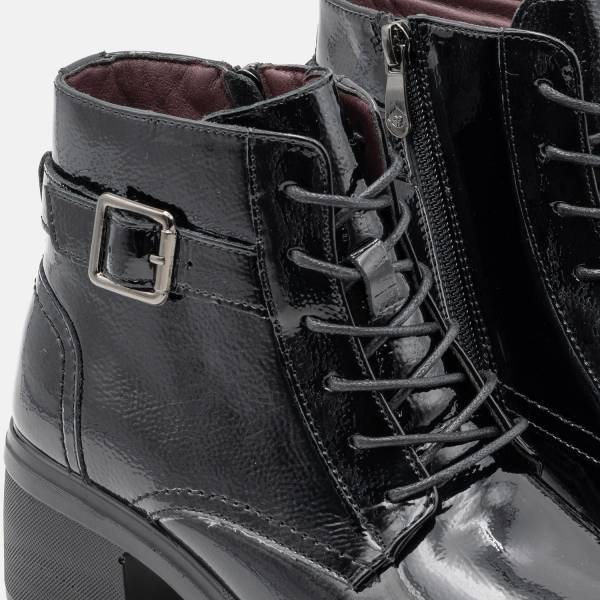 Botín en charol de gran calidad con cierre de cremallera y ajuste de hebilla y cordones. Suela de goma antideslizante con seis centímetros de altura. Un modelo urbano, casual y extremadamente cómodo. Un básico que necesita tu zapatero para todos tus looks.