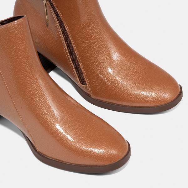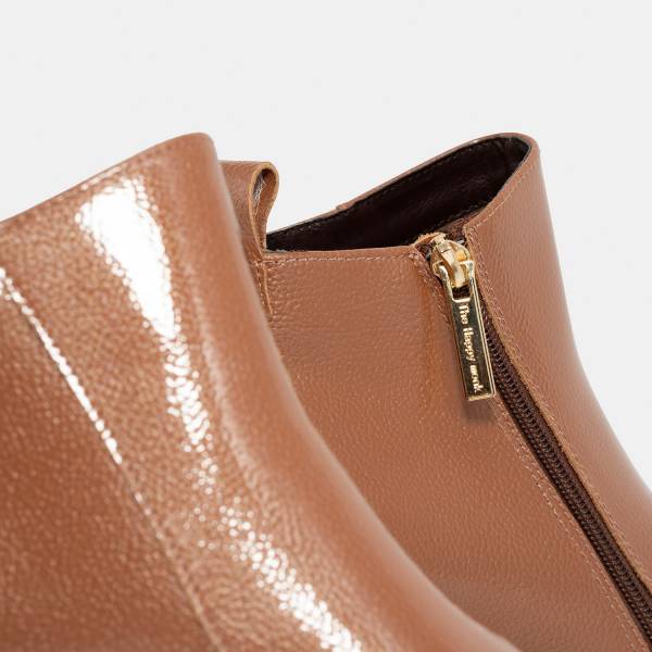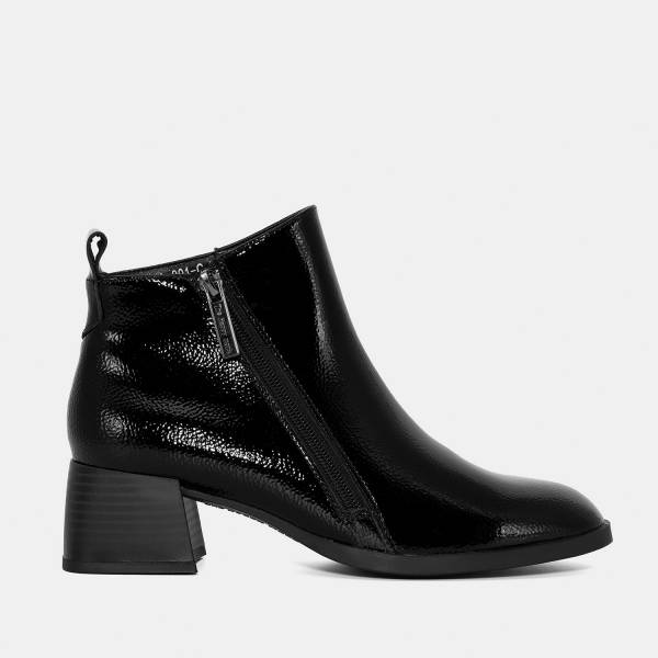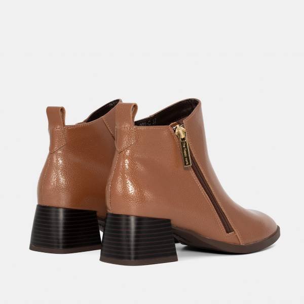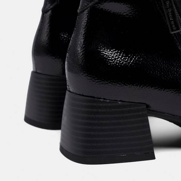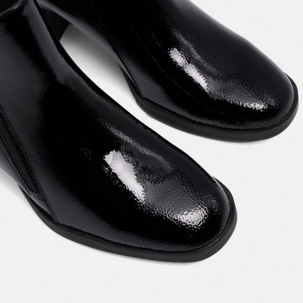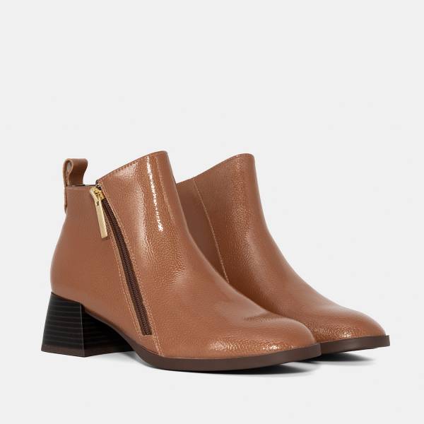 Botín de piel brillante con tacón de bloque de 4.50cm de altura y cierre de cremallera. Cuenta con plantilla Memory Gel para una mayor comodidad en cada pisada gracias a su acolchado. Suela de goma antideslizante. Un botín urbano y moderno para tu día a día o para ocasiones especiales.