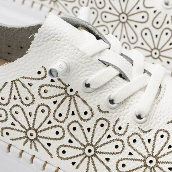 La línea Calpe-007 está fabricada con pieles naturales de alta calidad que aportan suavidad y durabilidad en cada uso. Incorpora planta Memory Gel extraíble para una pisada cómoda durante todo el día, suela cosida a mano y cierre con cordones elasticos que garantiza un ajuste perfecto. Su diseño fresco y actual destaca por los picados florales a láser, que aportan ligereza y un toque distintivo, convirtiéndolo en un modelo versátil ideal para acompañarte en todos tus looks diarios.