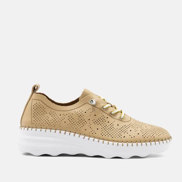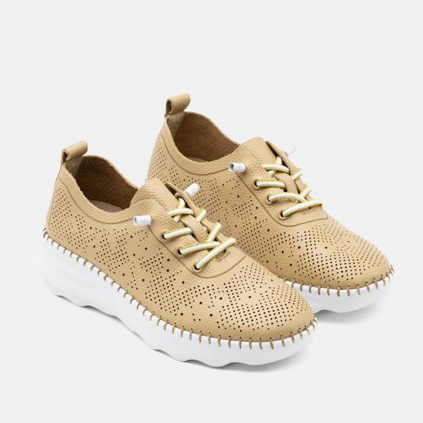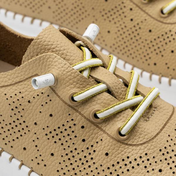 La línea Calpe-011 está fabricada con pieles naturales de primera calidad y un sofisticado diseño de picados láser que aporta frescura a cada paso. Incorpora planta Memory Gel, suela cosida a mano y cordones elásticos para un ajuste perfecto, logrando un equilibrio ideal entre estilo deportivo y confort.