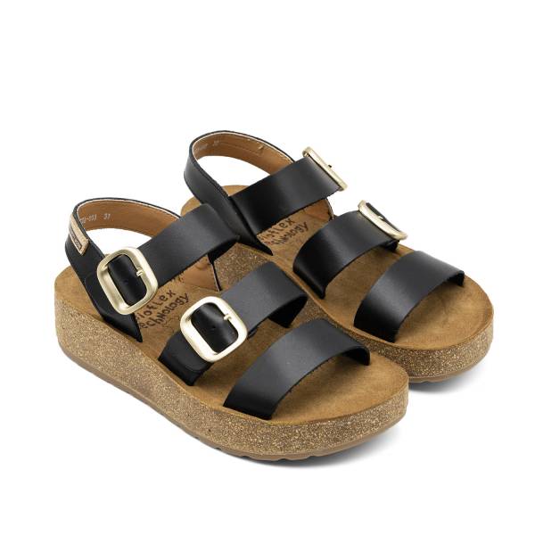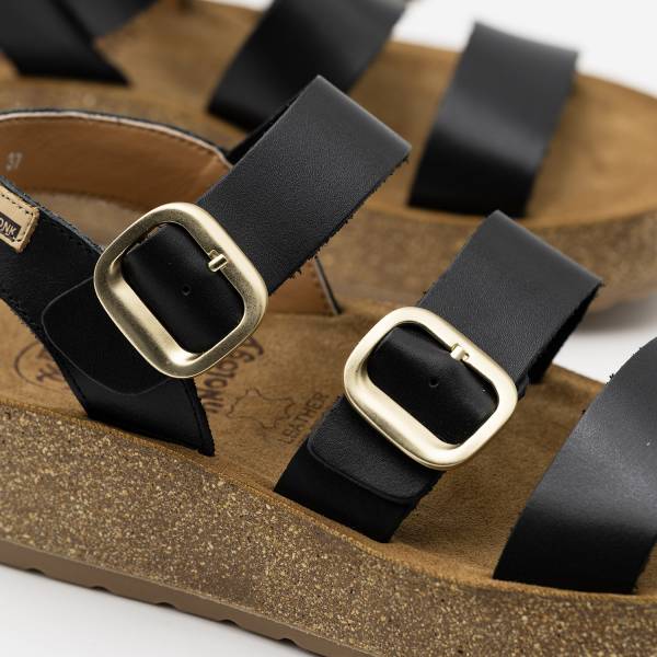 La línea Gomera-003 está fabricada con pieles naturales de alta calidad y un diseño de tres tiras con hebillas metálicas ajustables que garantizan una sujeción perfecta al pie. Incorpora una planta anatómica de gran confort sobre una suela de plataforma ligera con acabado de aspecto natural, fusionando un estilo contemporáneo con la máxima comodidad artesanal para el día a día.