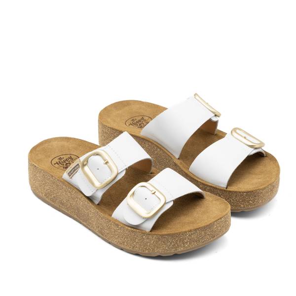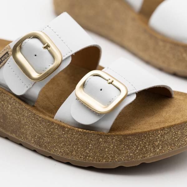 La línea Gomera-006 está fabricada con pieles naturales de primera calidad y se distingue por su elegante diseño de doble tira asimétrica con hebillas metálicas de bordes redondeados. Incorpora una planta anatómica diseñada para el descanso del pie sobre una suela de plataforma ligera con acabado de aspecto natural, combinando una sujeción excepcional con un estilo moderno y sofisticado.