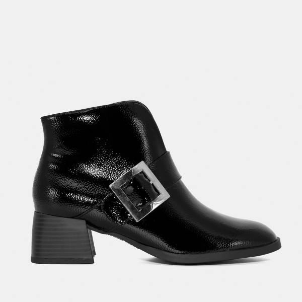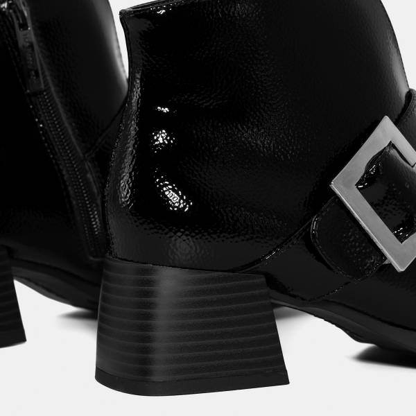 Botín de piel brillante con tacón de bloque de 4.50cm de altura. Detalle de cadena en su lateral y cierre de cremallera. Cuenta con plantilla Memory Gel para una mayor comodidad en cada pisada gracias a su acolchado. Suela de goma antideslizante. Un botín urbano y moderno para tu día a día o para ocasiones especiales.